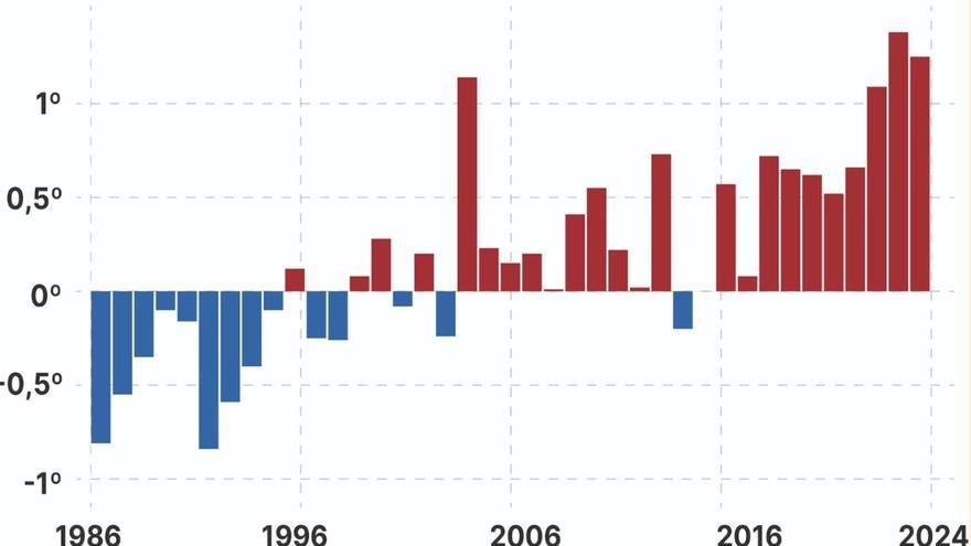 Desde 1986, las temperaturas del mar en la cuenca muestran una evolución clara. Primero, fueron más frías que la media (que fue de 22,6 °C) hasta finales de los 90. Luego comenzó una etapa de calentamiento, algo irregular al principio, pero con picos como el de 2003 (+1,14 °C). En la última década, el aumento se ha acelerado: 2023 y 2024 registraron anomalías récord, con temperaturas más de un grado por encima de lo habitual (1,38 °C y 1,25 °C más, respectivamente).