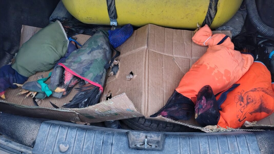 Al momento del control, los funcionarios observaron que en el baúl había ocho gallos de riña inmovilizados, atados, y envueltos en fundas de tela. Además, encontraron siete picos metálicos, dos tijeras entre otros elementos. Mientras que en el piso del asiento trasero había una jaula con 10 aves silvestres de la especie “cardenal” que también fueron rescatadas.