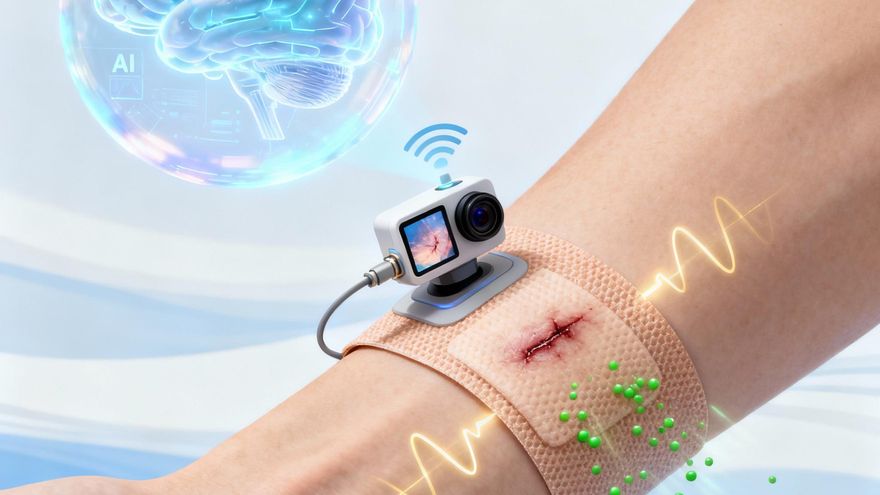 Un nuevo apósito bioelectrónico no se limita a cubrir una herida, sino que la observa con una cámara, diagnostica su estado con inteligencia artificial y le administra el tratamiento preciso —sea un estímulo eléctrico o un fármaco— para guiarla hacia una curación óptima y en tiempo récord.