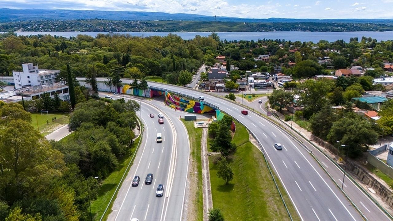 El puente que une la Autopista Córdoba–Carlos Paz con la avenida San Martín comenzó a cambiar su fisonomía. Una toma aérea permite apreciar la magnitud del mural que se ejecuta sobre más de 3.100 metros cuadrados en uno de los principales accesos a la ciudad.